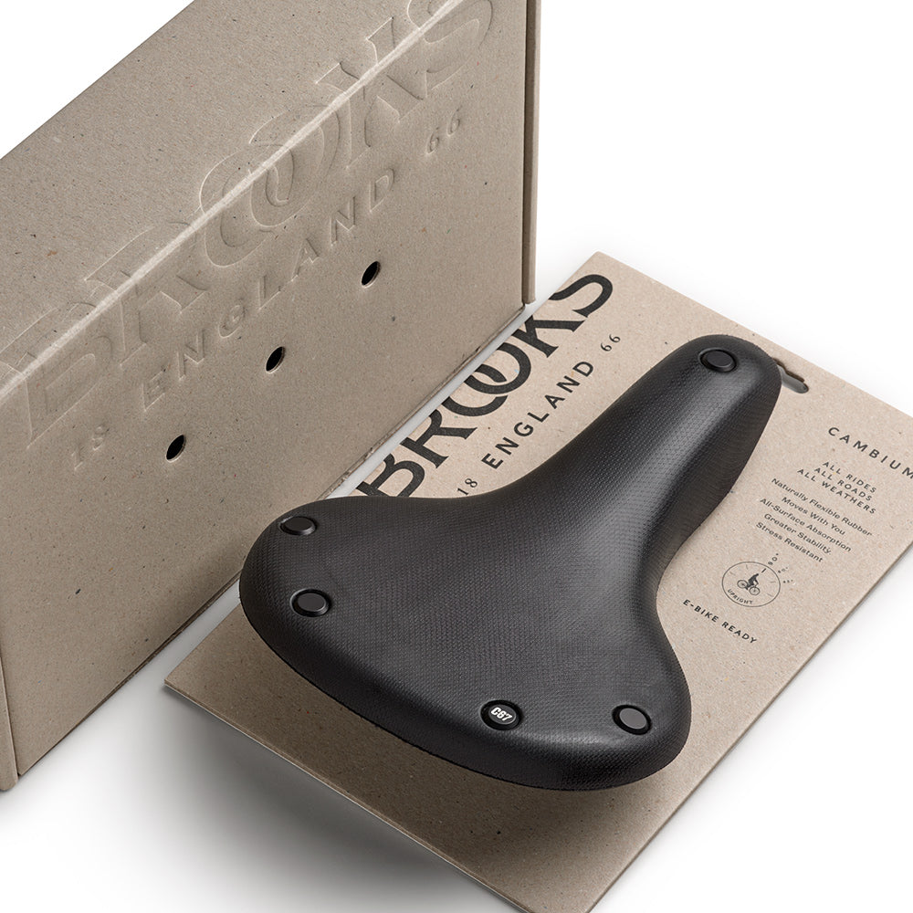 The Brooks England Cambium C67 is a wide, comfort-oriented saddle built for urban, e-bike, and everyday riders. Featuring the Brooks All Weather construction with a vulcanized natural rubber top and waterproof nylon cover, it delivers flexibility, shock absorption, and durability in all conditions. Its stable platform and upright geometry support a relaxed riding position, making it ideal for daily commutes and leisure rides.